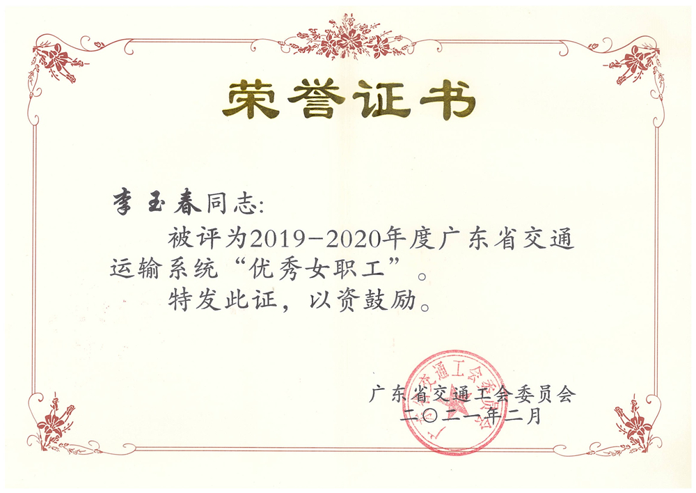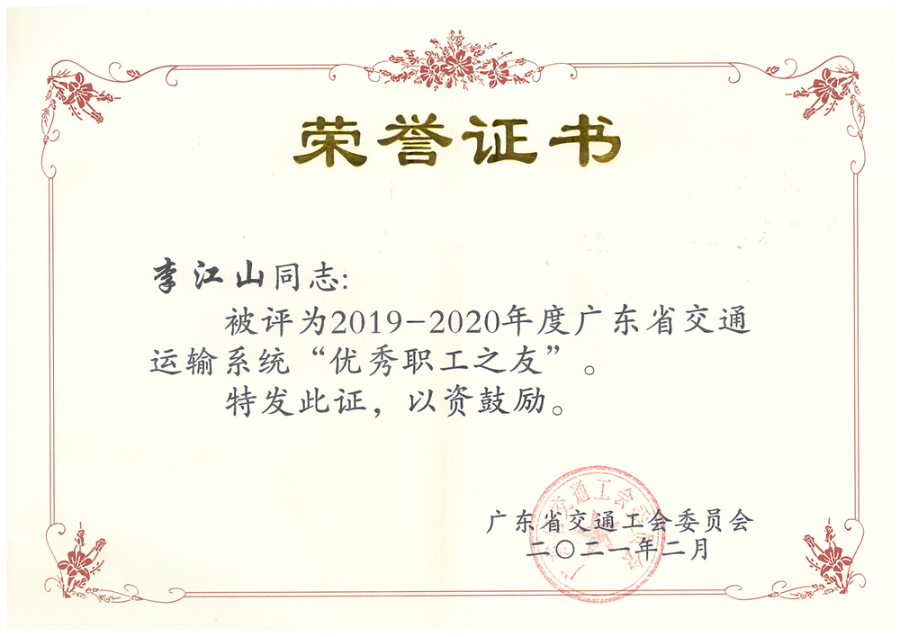 近日,公司工會被廣東省交通工會委員會授予2019-2020年度廣東省交通運輸系統(tǒng)“先進職工之家”榮譽稱號;公司董事長李江山同志被評為2019-2020年度廣東省交通運輸系統(tǒng)“優(yōu)秀職工之友”,人力資源部主任李玉春同志被評為“優(yōu)秀女職工”。