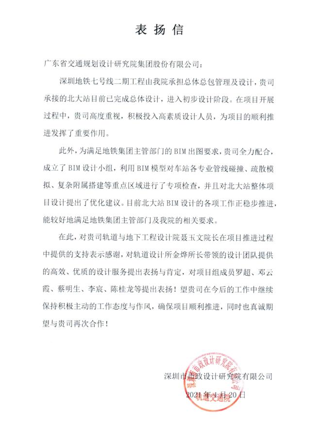 近日,項(xiàng)目總體單位深圳市市政設(shè)計(jì)研究院有限公司發(fā)來表揚(yáng)信,對(duì)我公司在深圳地鐵七號(hào)線二期工程北大站項(xiàng)目的總體設(shè)計(jì)、初步設(shè)計(jì)以及BIM設(shè)計(jì)等各項(xiàng)工作中所展現(xiàn)的高質(zhì)量專業(yè)技術(shù)水平和高素質(zhì)設(shè)計(jì)服務(wù)水平給予了充分肯定,并點(diǎn)名表揚(yáng)了具體負(fù)責(zé)該項(xiàng)目的團(tuán)隊(duì)組成員。