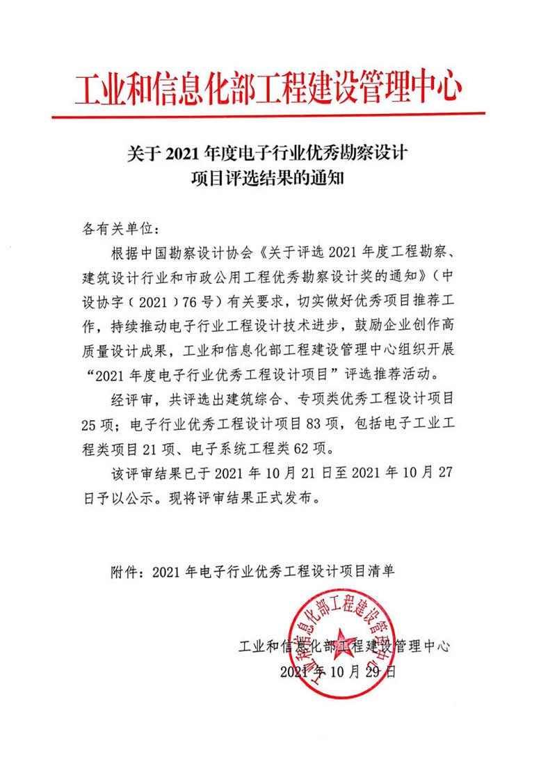 近日,我公司承擔(dān)的“廣東省南沙大橋(原稱虎門二橋)工程機(jī)電設(shè)計(jì)施工總承包”項(xiàng)目榮獲工業(yè)和信息化部工程建設(shè)管理中心“2021年度電子行業(yè)優(yōu)秀工程設(shè)計(jì)項(xiàng)目”電子系統(tǒng)工程類一等獎。這是公司首次獲得電子行業(yè)設(shè)計(jì)獎項(xiàng),標(biāo)志著我公司的智慧化設(shè)計(jì)能力在電子系統(tǒng)工程領(lǐng)域獲得了外部肯定和認(rèn)可。