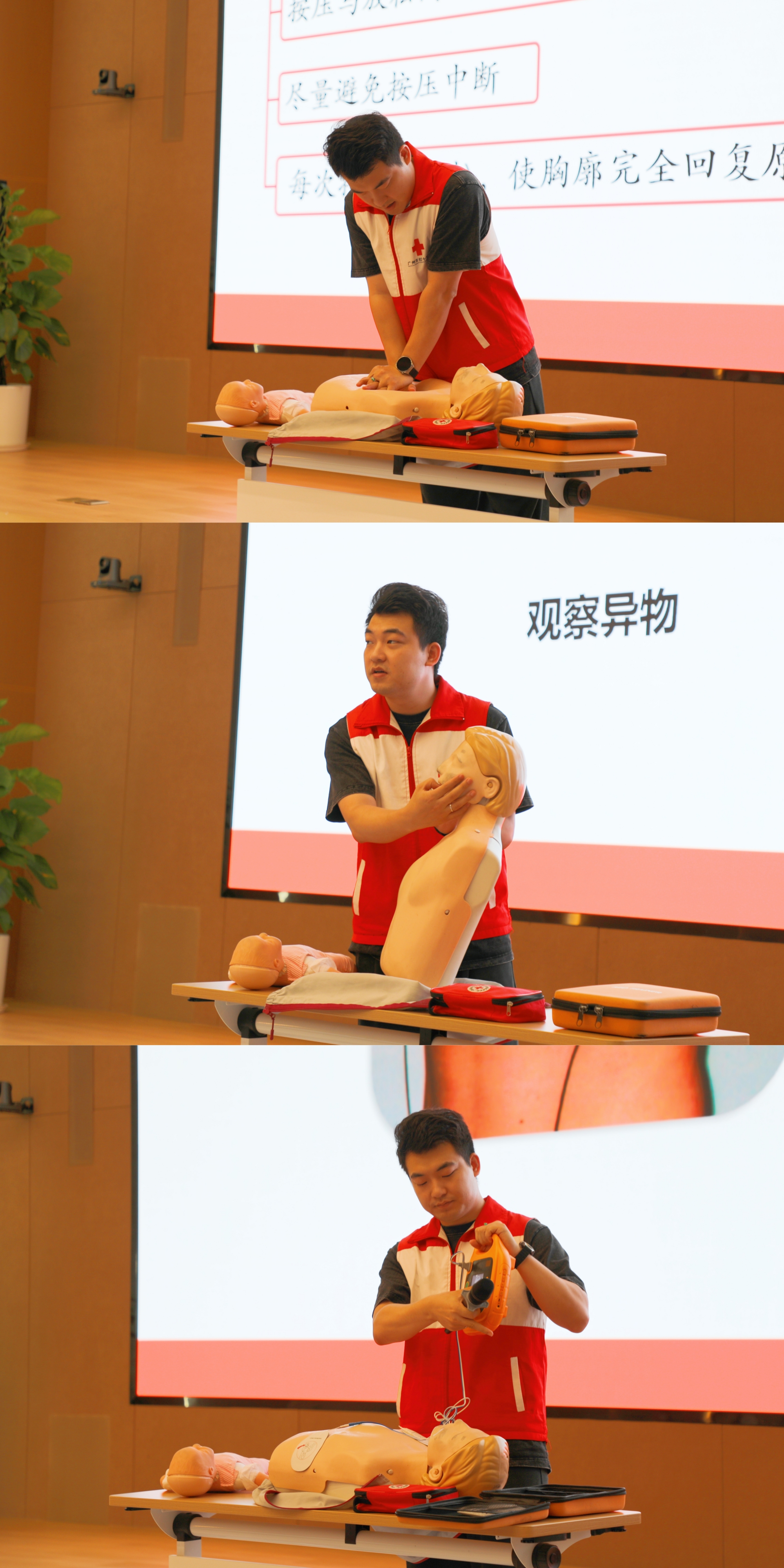 培訓(xùn)現(xiàn)場(chǎng),市紅十字會(huì)應(yīng)急救護(hù)講師結(jié)合救護(hù)案例,指出了常見(jiàn)的急救誤區(qū),提供了正確的急救觀念及講解了心肺復(fù)蘇術(shù)、AED的操作使用、氣道異物梗阻的處理、外出血的止血與包扎等應(yīng)急救護(hù)知識(shí),同時(shí),模擬演示了各項(xiàng)應(yīng)急救護(hù)的操作細(xì)節(jié)。