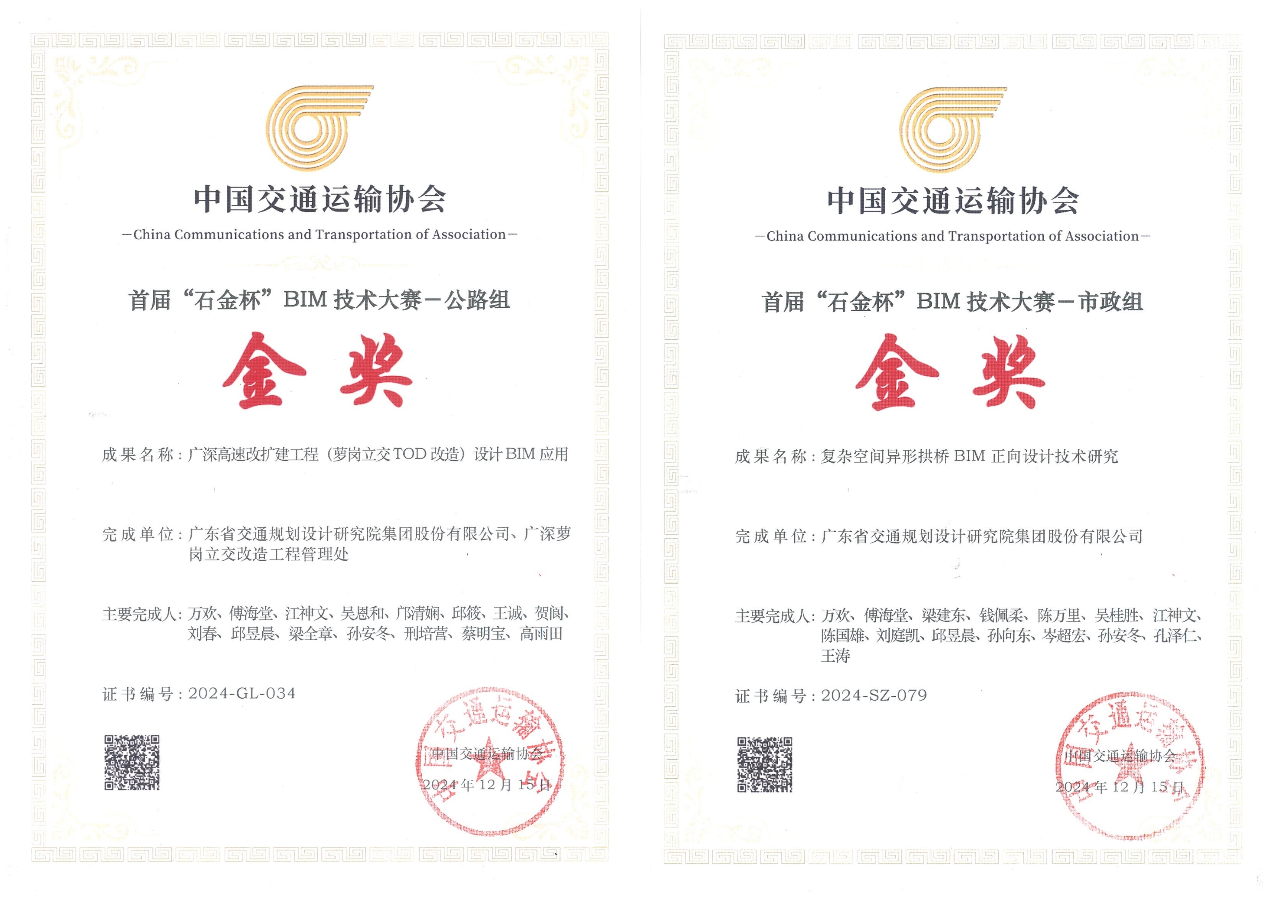 12月15日,中國(guó)交通運(yùn)輸協(xié)會(huì)首屆“石金杯”BIM技術(shù)大賽頒獎(jiǎng)典禮在西安市隆重召開。經(jīng)過初賽和決賽現(xiàn)場(chǎng)答辯,公司《廣深高速改擴(kuò)建工程(蘿崗立交TOD改造)設(shè)計(jì)BIM應(yīng)用》和《復(fù)雜空間異形拱橋BIM正向設(shè)計(jì)》在500多個(gè)項(xiàng)目中脫穎而出,分別榮獲公路組金獎(jiǎng)和市政組金獎(jiǎng)。