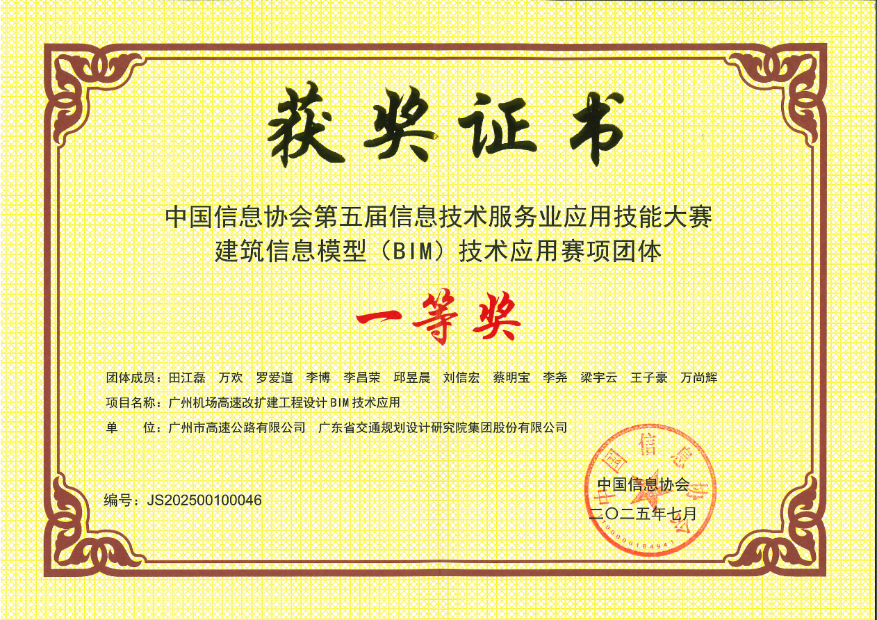 7月21日,2025年度中國信息協(xié)會第五屆信息技術服務業(yè)應用技能大賽頒獎典禮在北京隆重召開。經(jīng)過選拔賽、決賽和專家審議復查,公司《廣州機場高速改擴建工程設計BIM技術應用》項目從全國各工程行業(yè)900余個BIM參評項目的激烈競爭中脫穎而出,榮獲一等獎。