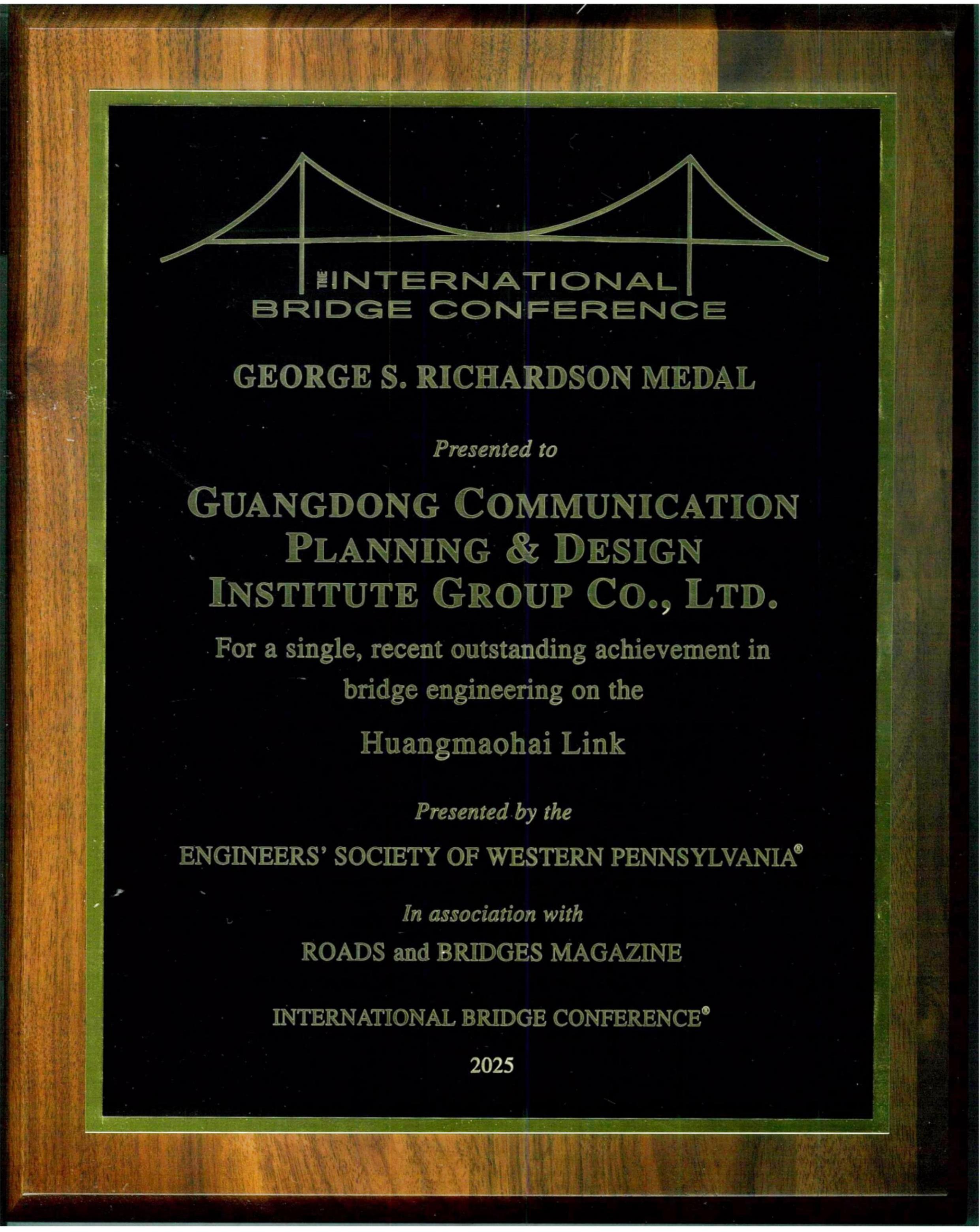 近日,公司承擔(dān)的黃茅海跨海通道項(xiàng)目榮獲2025年喬治?理查德森獎(GeorgeS.Richardson Medal),成為本屆我國唯一獲此殊榮的項(xiàng)目。作為獲獎單位,公司受邀參加了2025年7月14日-16日(美國當(dāng)?shù)貢r間)在賓夕法尼亞匹茲堡舉行的第42屆國際橋梁大會(International Bridge Conference,簡稱IBC),公司第四設(shè)計(jì)院總工程師徐德志作為公司代表參加了大會并領(lǐng)取了獎項(xiàng)。