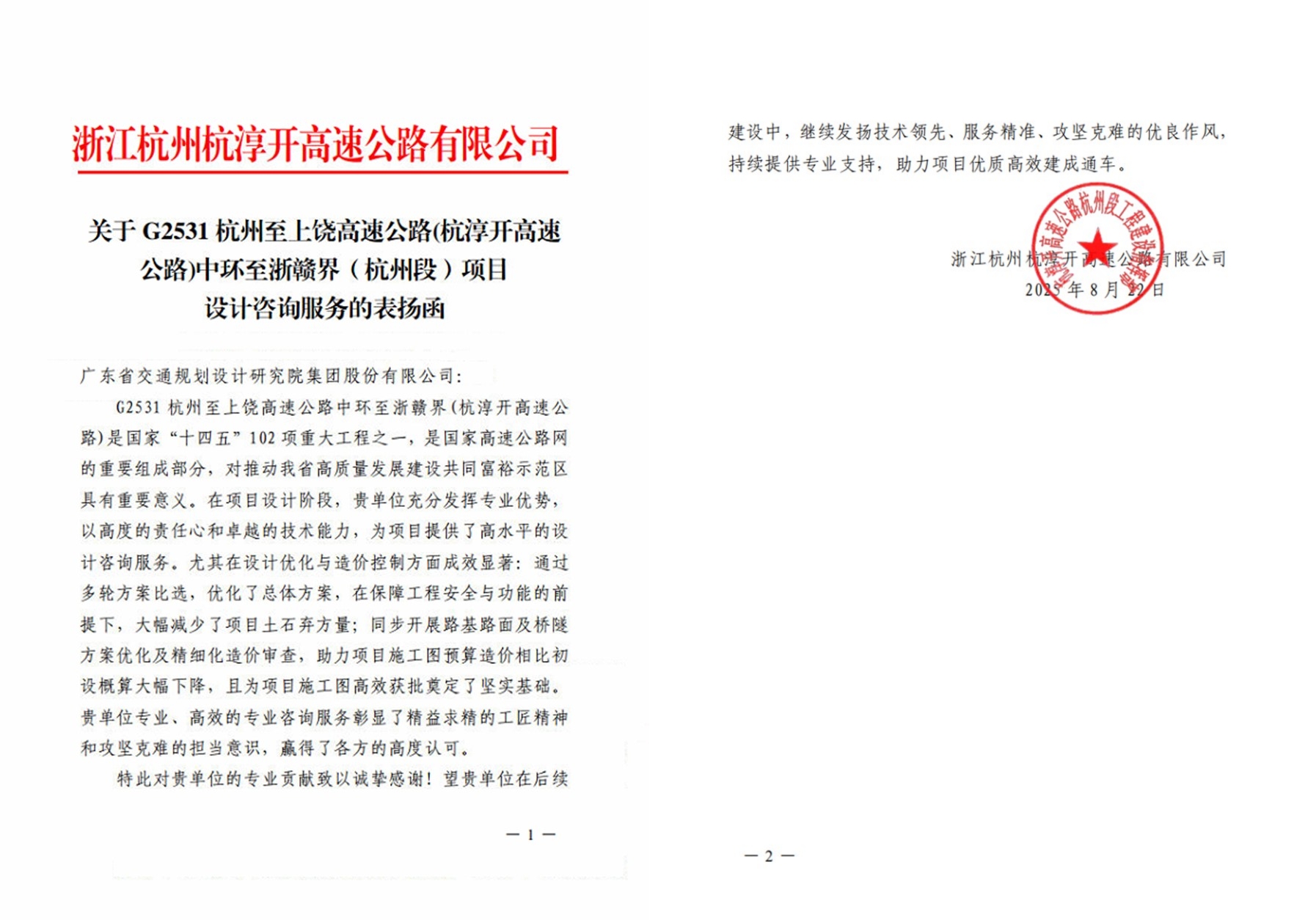 近日,浙江杭州杭淳開(kāi)高速公路有限公司發(fā)來(lái)表?yè)P(yáng)信,對(duì)公司為G2531杭州至上饒高速公路杭州中環(huán)至浙贛界杭州段項(xiàng)目(以下簡(jiǎn)稱“杭淳開(kāi)高速公路”)技術(shù)咨詢服務(wù)作出的貢獻(xiàn)以及項(xiàng)目組成員的優(yōu)秀工作表現(xiàn)提出了表?yè)P(yáng)。