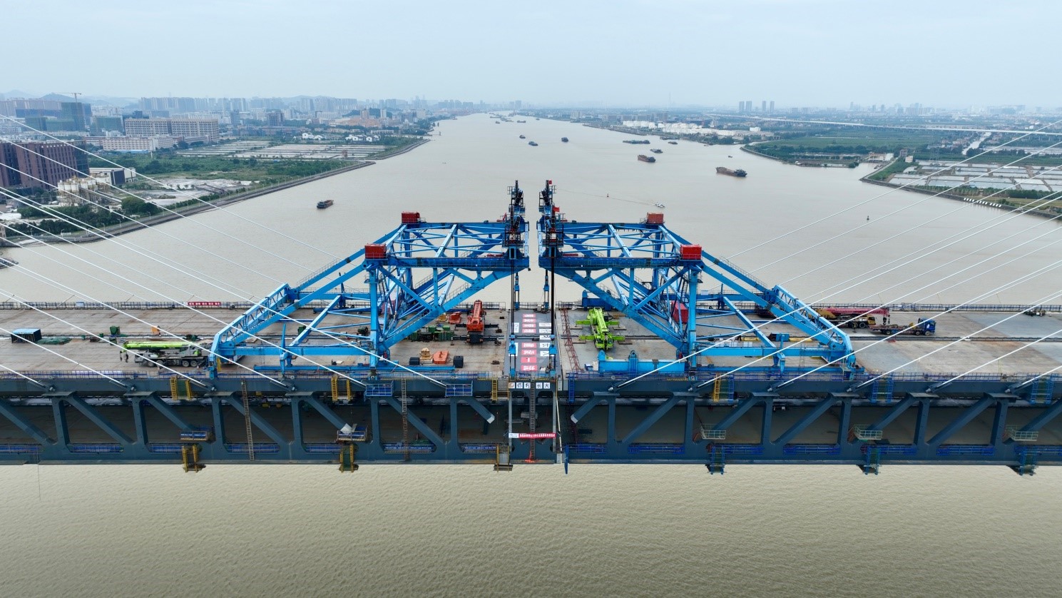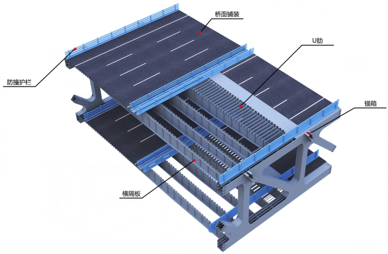 主梁采用超寬雙層鋼桁梁結(jié)構(gòu),全寬達(dá)42.2m。橋面采用密橫梁體系,具有結(jié)構(gòu)簡(jiǎn)潔、橫向剛度均勻、橫梁抗疲勞性能優(yōu)良等特點(diǎn)。索塔兩側(cè)各布置30對(duì)平行鋼絲斜拉索,最大索力達(dá)970噸。邊跨下層采用混凝土面板壓重方案,通過(guò)采取合理的混凝土面板布置及施工順序,有效解決施工過(guò)程中橋面板易開裂的難題,橫向鋼混結(jié)合段采用UHPC混凝土,顯著提升橋面板抗裂性能。