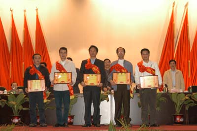 在歡快的音樂聲中,獲獎的先進(jìn)集體代表和先進(jìn)個(gè)人依次上臺領(lǐng)獎,他們身披紅綢帶,喜氣洋洋地接過獎牌和獎狀。
