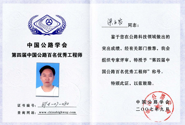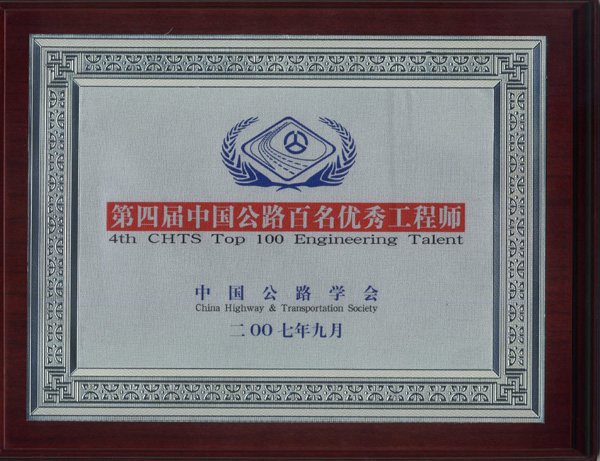 榮獲“第四屆中國公路百名優(yōu)秀工程師”稱號