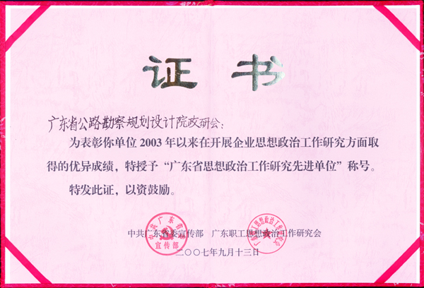 省委宣傳部、省政研會《關于表彰廣東省思想政治工作研究先進單位和先進工作者的通報》獲悉,我院榮獲先進單位稱號,刷新思想政治工作研究榮獲省級獎勵的紀錄。這是對我院2006年“職工思想政治教育年”活動的充分肯定,同時也是近年來我院在體制轉型時期深入實踐科學發(fā)展觀,加強員工思想政治教育工作,努力探索企業(yè)文化建設,構建和諧企業(yè),促進企業(yè)健康發(fā)展方面所取得的優(yōu)秀成果。我們堅信,這將成為我院思想政治工作研究的新動力,必將促進我院企業(yè)文化建設的新發(fā)展。 本次思想政治工作研究先進單位和工作者評選活動,在全省范圍內共評選出67個先進單位和65位先進工作者。