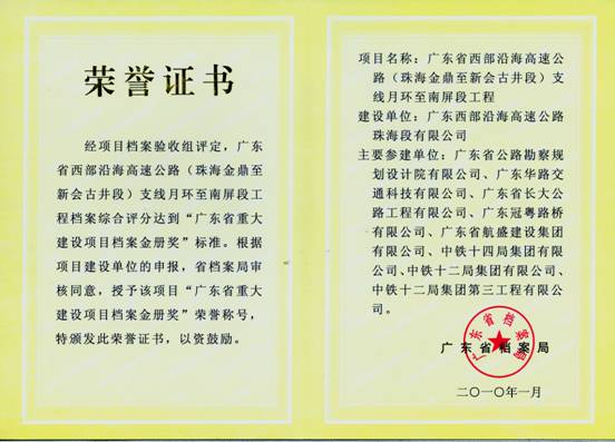 日前,由我司作為主要參建單位之一的廣東省西部沿海高速公路(珠海金鼎至新會古井段)支線月環(huán)至南屏段工程項目檔案榮獲2009年“廣東省重大建設項目檔案金冊獎”。 “廣東省重大建設項目檔案金冊獎”由省檔案局和省發(fā)改委2007年根據(jù)國家檔案局和發(fā)改委的有關精神聯(lián)合設立,2009年僅有兩個項目獲此殊榮。
