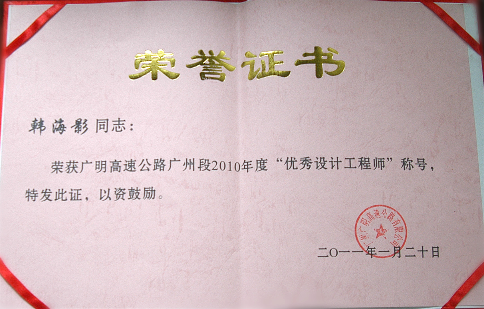 近日,我司第二路橋設(shè)計(jì)部韓海影同志受到業(yè)主單位廣州廣明高速公路有限公司表彰,榮獲廣明高速公路廣州段2010年度“優(yōu)秀設(shè)計(jì)工程師”稱號(hào),為公司贏得了良好的聲譽(yù),特此祝賀!