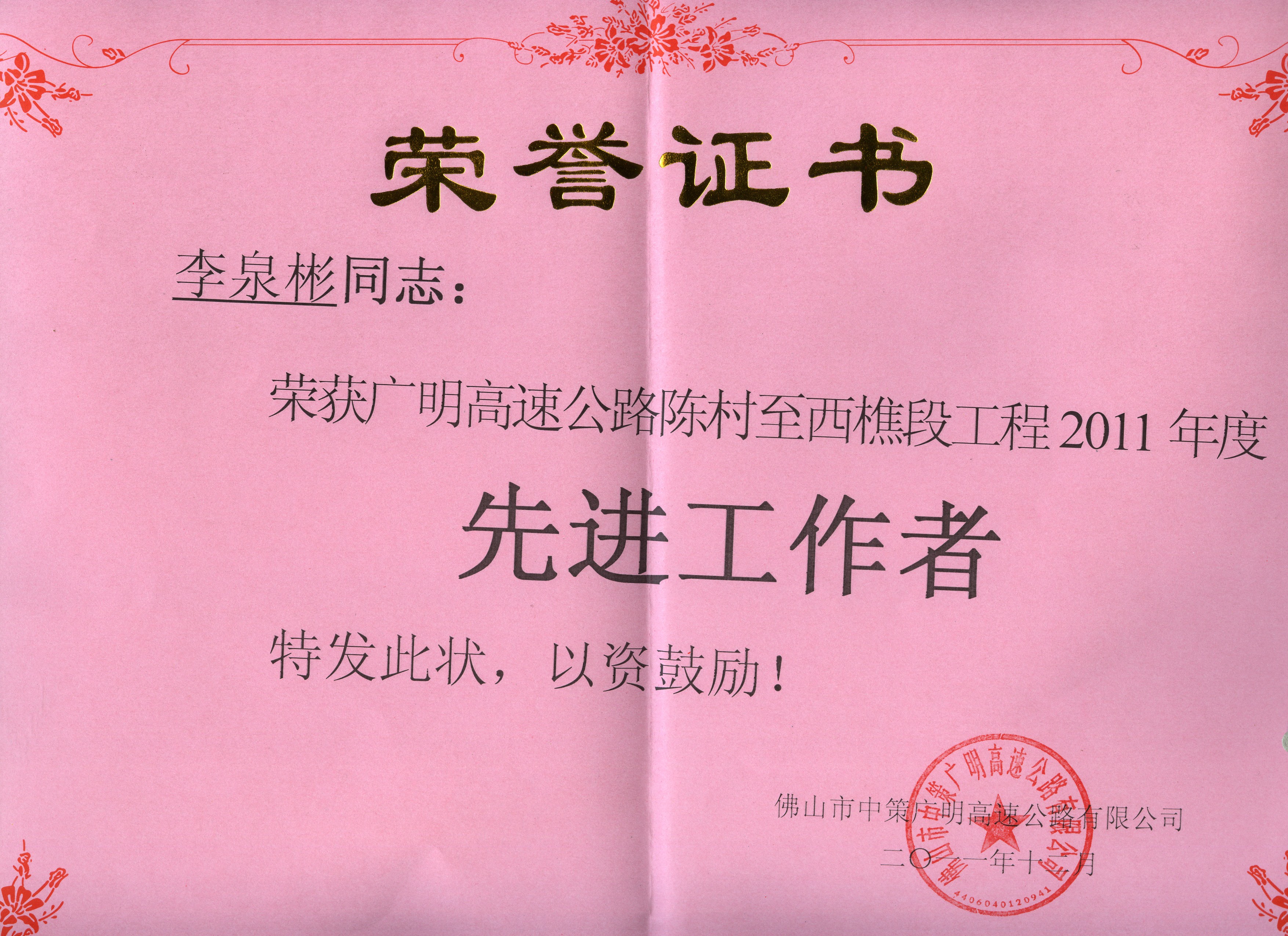 近日,第三路橋設(shè)計(jì)部設(shè)計(jì)代表李泉彬同志受到業(yè)主單位佛山市中策廣明高速公路有限公司表彰,榮獲廣明高速陳村至西樵段工程2011年度“先進(jìn)工作者”稱號(hào),為公司樹立了良好的外部形象,贏得了榮譽(yù),特表祝賀。