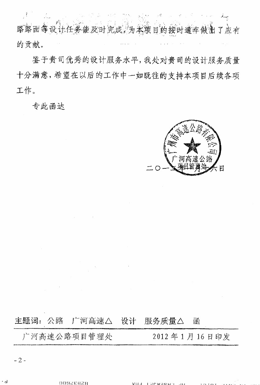 近日,業(yè)主單位廣河高速公路項目管理處專函盛贊公司設(shè)計后服務(wù)工作,并對以第二路橋設(shè)計部為主的服務(wù)團隊在廣州至河源高速公路廣州段設(shè)計后服務(wù)中的優(yōu)異表現(xiàn)給予了充分肯定和高度贊揚,認為我司設(shè)計服務(wù)水平“優(yōu)秀”,對我司的服務(wù)質(zhì)量表示“十分滿意”。