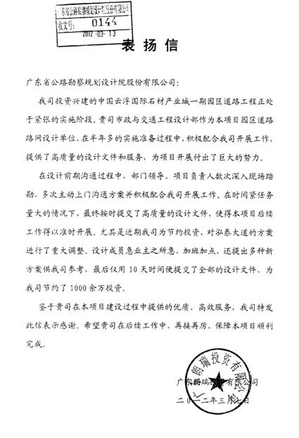 近日,廣東朗瑞投資有限公司向公司發(fā)來表揚(yáng)信,對(duì)市政與交通工程部在云浮國際石材產(chǎn)業(yè)城一期園區(qū)道路路網(wǎng)項(xiàng)目中提供的“高效、優(yōu)質(zhì)”的設(shè)計(jì)文件和服務(wù)給予了充分肯定和高度贊揚(yáng)。特表祝賀!