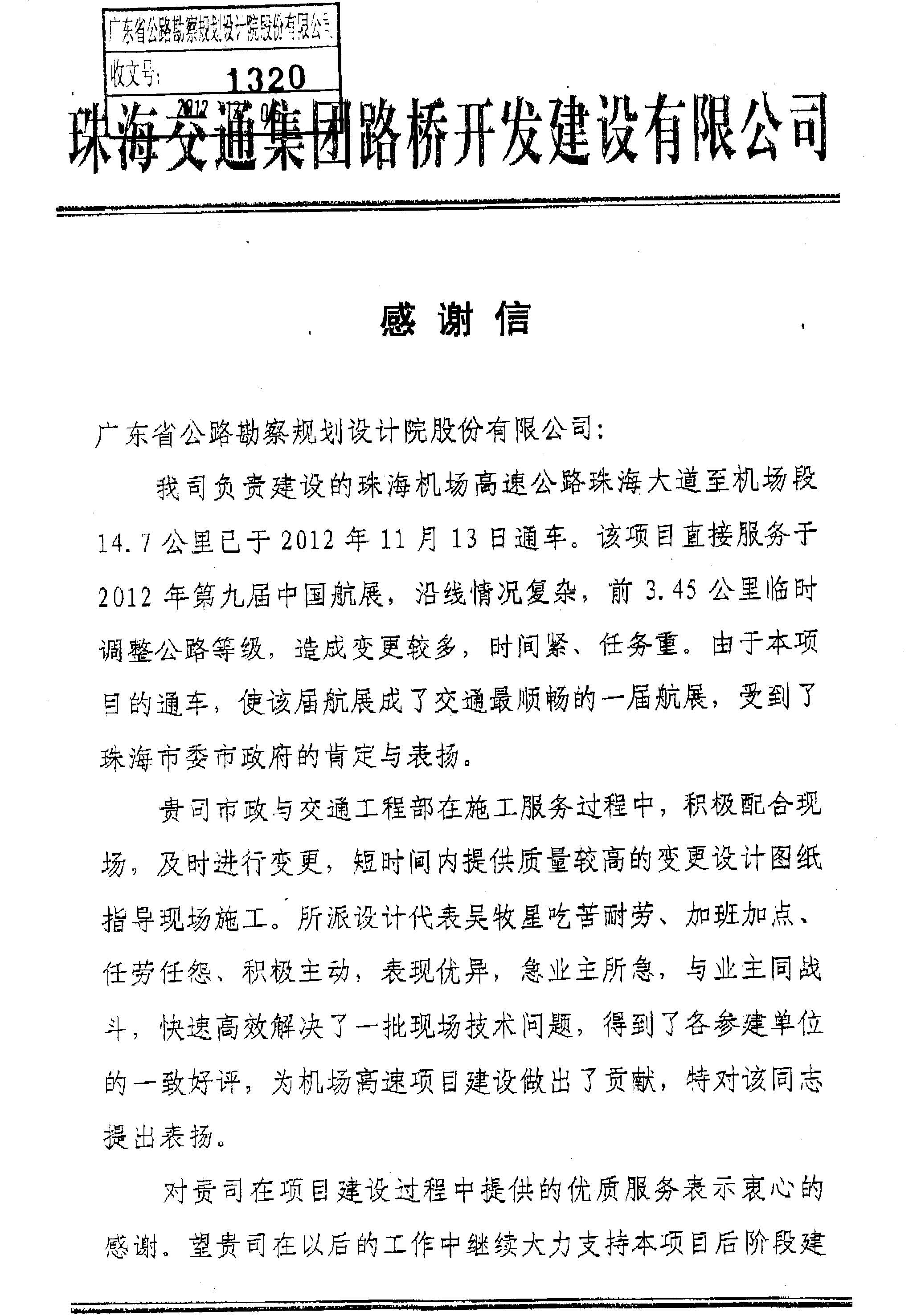近日,珠海交通集團有限公司珠海機場高速公路項目管理部發(fā)來感謝信,對公司市政與交通工程部團隊在珠海機場高速珠海大道至機場段項目中提供的“優(yōu)質服務”表示滿意和感謝。目前該項目已經完工通車,為第九屆中國航展提供了順暢的交通服務。