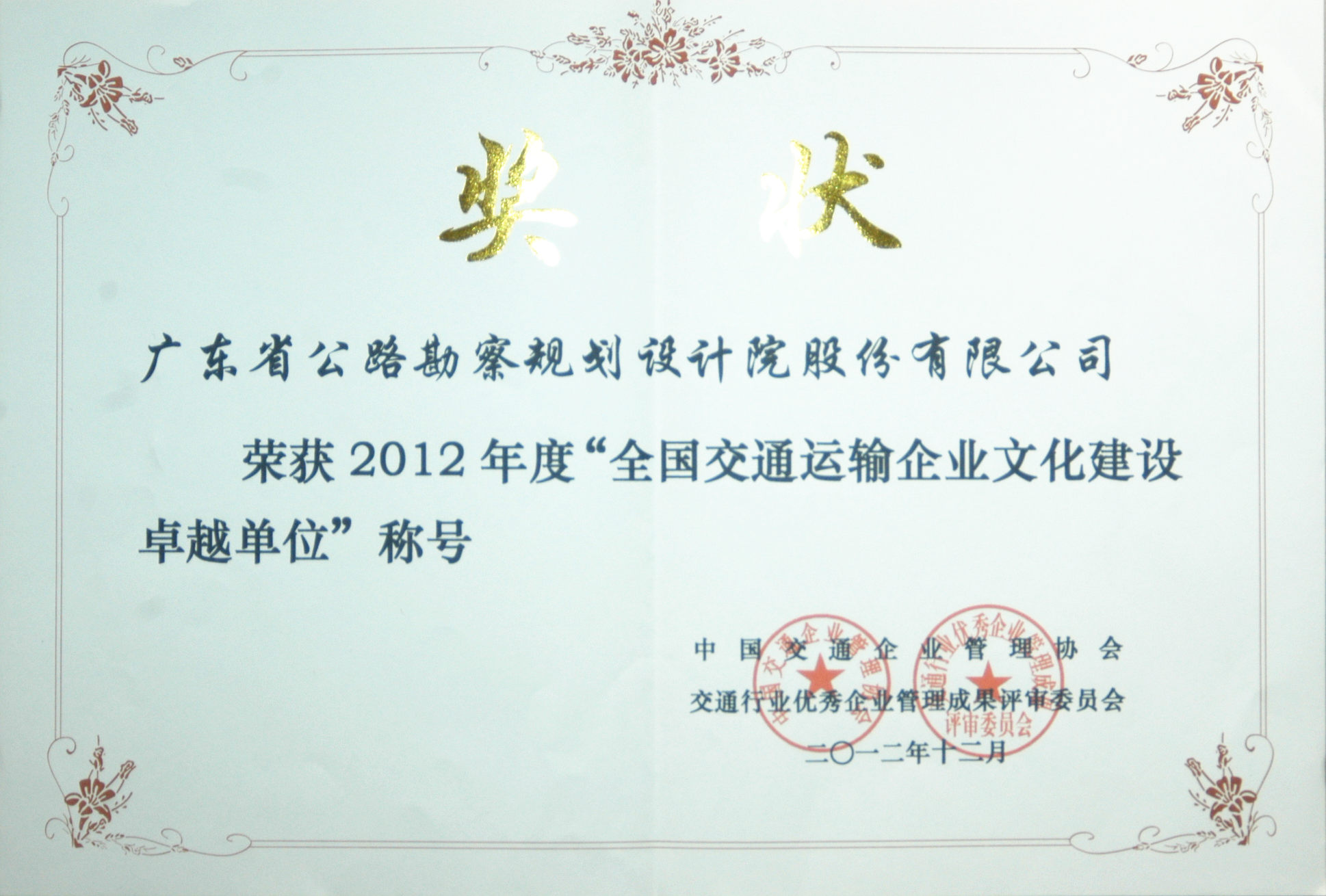 熱烈祝賀公司2012年度蟬聯(lián)“全國交通運(yùn)輸企業(yè)文化建設(shè)卓越單位”稱號。繼2009、2010兩年榮獲“全國交通運(yùn)輸企業(yè)文化建設(shè)優(yōu)秀單位”、2011年榮獲“全國交通運(yùn)輸企業(yè)文化建設(shè)卓越單位”稱號后,這是公司企業(yè)文化建設(shè)第四次獲此殊榮。該獎由中國交通企業(yè)管理協(xié)會、交通行業(yè)優(yōu)秀企業(yè)管理成果評審委員會聯(lián)合頒發(fā)。