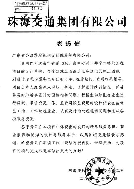 近日,珠海交通集團(tuán)有限公司發(fā)專函表?yè)P(yáng)我司在省道S365線中心涌至井岸二橋段工程中提供的的技術(shù)服務(wù),對(duì)我司的精品服務(wù)意識(shí)、員工職業(yè)素養(yǎng)和優(yōu)秀的設(shè)計(jì)與服務(wù)水平給予了充分肯定。該項(xiàng)目由市政與交通工程設(shè)計(jì)部承擔(dān)。