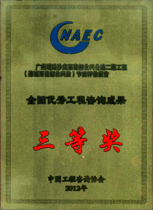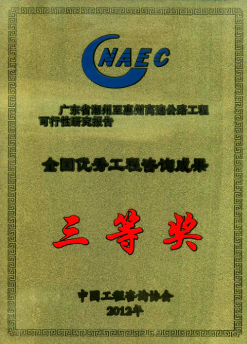 熱烈祝賀: 公司兩項(xiàng)目榮獲2012年度全國優(yōu)秀工程咨詢成果獎(jiǎng) 1、廣東省潮州至惠州高速公路工程可行性研究報(bào)告榮獲三等獎(jiǎng) 2、廣州增城沙莊至花都北興公路二期工程(荔城至花都北興段)節(jié)能評(píng)估報(bào)告榮獲三等獎(jiǎng)