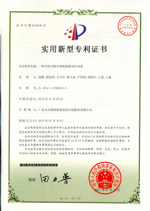 2、“一種可檢可換可調(diào)的拱橋吊桿體系”,被授予實用新型專利權(quán)。