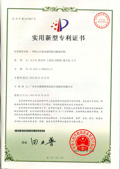 3、“一種防止污染水源的橋式隧道結(jié)構(gòu)”,被授予實用新型專利權(quán)。