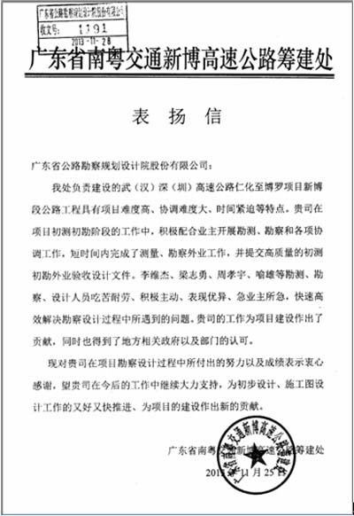 近日,廣東省南粵交通新博高速公路籌建處發(fā)來表揚信,高度肯定我司在項目初測初勘工作中的努力和成績,對我司短期內(nèi)高質(zhì)量完成任務(wù)表示滿意,同時點名表揚了李維杰、梁志勇、周孝宇、喻雄等一批項目組成員。特此報喜。