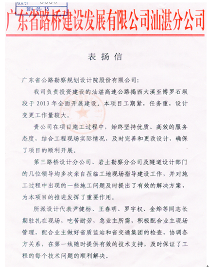 近日,省路橋建設(shè)發(fā)展有限公司汕湛分公司發(fā)來表揚(yáng)信,對(duì)我司在汕湛高速公路揭西大溪至博羅石壩段項(xiàng)目中提供的優(yōu)質(zhì)、高效的設(shè)計(jì)后服務(wù)表示高度贊揚(yáng),對(duì)負(fù)責(zé)該項(xiàng)目的第三路橋設(shè)計(jì)分公司、巖土勘察分公司及隧道設(shè)計(jì)部,和尹健標(biāo)、王春明等一批設(shè)計(jì)代表的工作表示感謝。特此報(bào)喜。