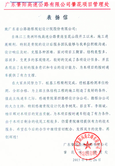 近日,廣東肇陽高速公路有限公司肇花項(xiàng)目管理處發(fā)來表揚(yáng)信,對我司在珠江三角洲環(huán)線高速公路黃崗至花山段項(xiàng)目中提供的高效、優(yōu)質(zhì)服務(wù)表示贊揚(yáng),同時(shí)對負(fù)責(zé)該項(xiàng)目的第四路橋設(shè)計(jì)分公司等組織和個(gè)人給予了通報(bào)表揚(yáng)。特此報(bào)喜。