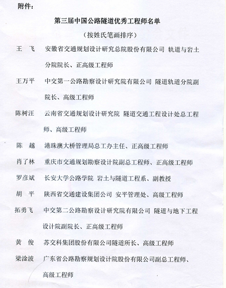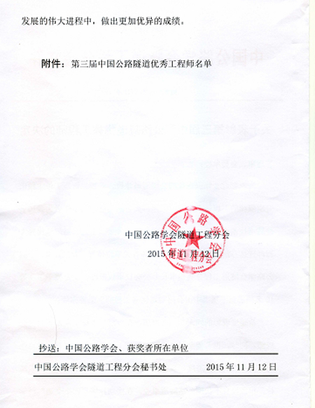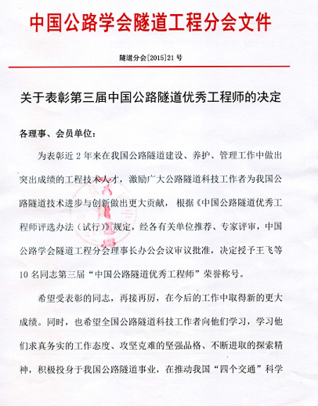 公司梁淦波副總工程師榮獲“第三屆中國公路隧道優(yōu)秀工程師”稱號,并在近日召開的2015年全國公路隧道學(xué)術(shù)年會上獲得了表彰,全國共有10名同志獲得該榮譽稱號。特此祝賀!