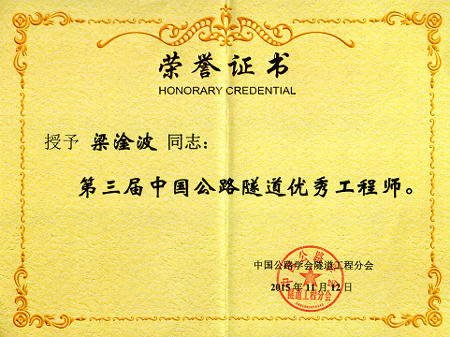 梁淦波副總工程師榮獲第三屆中國公路隧道優(yōu)秀工程師稱號