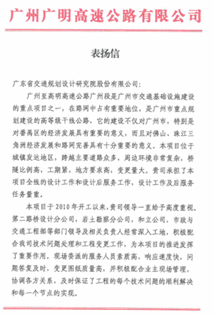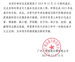 近日,廣州廣明高速公路有限公司發(fā)來表揚信,對我司在廣州至高明高速公路廣州段中提供的高效、優(yōu)質(zhì)服務表示贊揚,同時對負責該項目的第二路橋設計分公司等組織及個人給予了通報表揚。目前該項目鐘村至吳家圍段于2014年12月31日順利通車,化龍至鐘村段已基本完成主體工程,即將達成2015年底通車的目標。