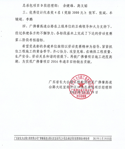 近日,我司第五路橋設(shè)計分公司駐廣佛肇高速公路大旺至封開江口段設(shè)計代表牟鍵超同志受到廣東省長大公路工程有限公司廣佛肇高速公路大旺至封開江口段總承包項目經(jīng)理部表彰,榮獲廣佛肇高速2015年勞動競賽第二階段 “優(yōu)秀設(shè)計代表”稱號。特此報喜。
