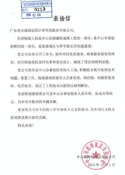 近日,中山市路橋建設(shè)有限公司發(fā)來表揚(yáng)信,對(duì)我司在東部快線工程中的提供的高效、優(yōu)質(zhì)的設(shè)計(jì)后服務(wù)表示贊揚(yáng),同時(shí)該項(xiàng)目所屬的第一路橋設(shè)計(jì)分公司及設(shè)計(jì)代表呂明、張永杰等個(gè)人給予了通報(bào)表揚(yáng)。特此報(bào)喜。