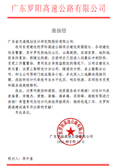 近日,廣東羅陽高速公路有限公司發(fā)來表?yè)P(yáng)信,對(duì)我司在羅陽高速公路項(xiàng)目中的突出表現(xiàn)表示贊揚(yáng),同時(shí)對(duì)負(fù)責(zé)該項(xiàng)目的第三路橋設(shè)計(jì)分公司等組織和設(shè)計(jì)代表等個(gè)人給予了通報(bào)表?yè)P(yáng)。特此報(bào)喜。