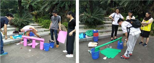 (隊(duì)員們完成“水到渠成”任務(wù):利用卡紙搭建橋梁,讓乒乓球由指定一方到達(dá)另一方(橋梁要求最低離地50cm))