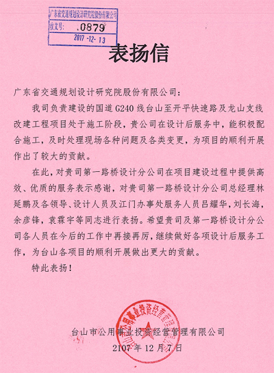 近日,臺山市公用事業(yè)投資經(jīng)營管理有限公司發(fā)來表揚信,對我司在國道G240線臺山至開平快速路及龍山支線改建工程中提供的高效、優(yōu)質(zhì)的設(shè)計后服務(wù)表示肯定,對負(fù)責(zé)該項目的第一路橋設(shè)計分公司及相關(guān)領(lǐng)導(dǎo)、設(shè)計人員及江門辦事處服務(wù)人員給予了通報表揚,特此報喜!