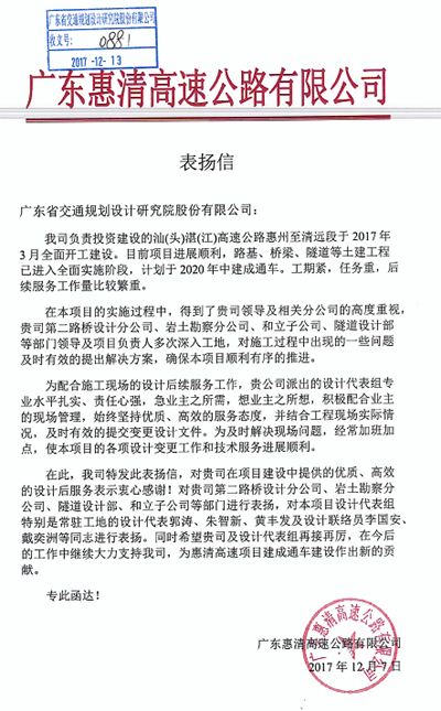 近日,廣東惠清高速公路有限公司發(fā)來表揚(yáng)信,對(duì)我司在汕湛高速公路惠州至清遠(yuǎn)段工程項(xiàng)目中提供的優(yōu)質(zhì)、高效的設(shè)計(jì)后服務(wù)表示肯定和感謝,對(duì)負(fù)責(zé)該項(xiàng)目的第二路橋設(shè)計(jì)分公司、巖土勘察分公司、和立公司、隧道設(shè)計(jì)部等部門給予了充分的肯定,對(duì)駐地設(shè)計(jì)代表郭濤、朱智新、黃豐發(fā)等給予了通報(bào)表揚(yáng),特此報(bào)喜! 該項(xiàng)于2017年3月全面開工建設(shè),計(jì)劃于2020年中建成通車。