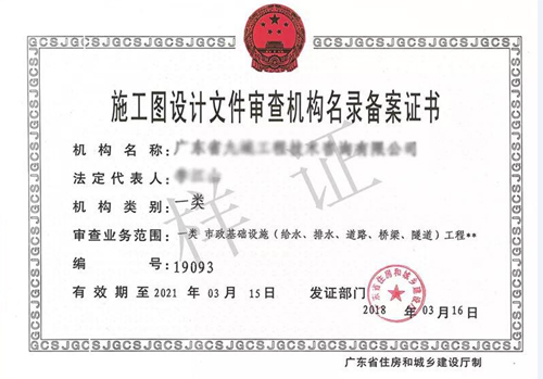 2018年3月16日,在廣東省住房和城鄉(xiāng)建設(shè)廳發(fā)布的《廣東省住房和城鄉(xiāng)建設(shè)廳關(guān)于廣東省九域工程技術(shù)咨詢有限公司等4家施工圖審查機(jī)構(gòu)名錄備案審查結(jié)果的公告》中,我公司下屬全資子公司廣東省九域工程技術(shù)咨詢有限公司獲取一類施工圖審查資質(zhì),正式被錄入我省房屋建筑和市政基礎(chǔ)設(shè)施工程施工圖設(shè)計(jì)文件審查機(jī)構(gòu)名錄。后期將通過(guò)市政設(shè)計(jì)業(yè)務(wù)帶動(dòng)施工圖審查業(yè)務(wù)發(fā)展,形成市政設(shè)計(jì)與施工圖審查業(yè)務(wù)相輔相成,相互促進(jìn)的良好發(fā)展局面。