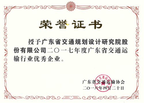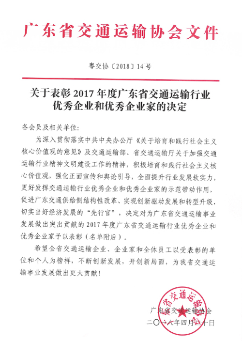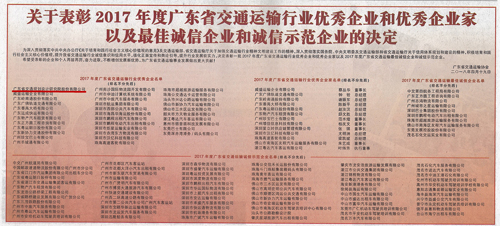 公司榮獲2017年度廣東省交通運輸行業(yè)優(yōu)秀企業(yè)榮譽稱號