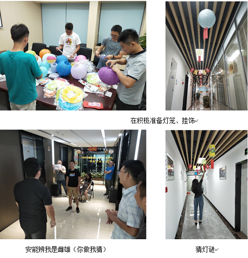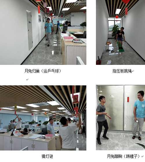 天花板下懸掛了一串串燈籠和燈謎;在辦公區(qū)的4個方位還設(shè)置了“月兔蹴鞠”“月兔歸巢”“安能辨我是雌雄”以及指壓板跳繩等游戲區(qū)和兌獎區(qū),吸引大家參與其中。節(jié)日的氣氛洋溢在現(xiàn)場的每個角落。贏取到游戲中的精美禮品的大伙兒滿載而歸,在歡聲笑語中提前度過了一個快樂而有意義的中秋佳節(jié)。