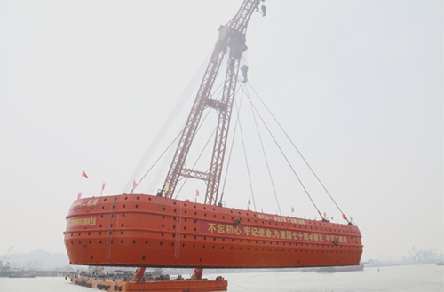 東江南支流港灣大橋主墩承臺防撞套箱,采用固定式釋能附體型結構。鋼套箱長73.12米、寬23.8米、高9.5米,重量約1100噸,正常使用壽命為30年。本次下放的鋼套箱為主橋25#墩。大橋所在的東莞水道為5000噸級海輪航道,橋位區(qū)域河流航道繁忙,船舶流量約每天400艘次,鋼套箱下放施工難度大,通航安全風險極高。
