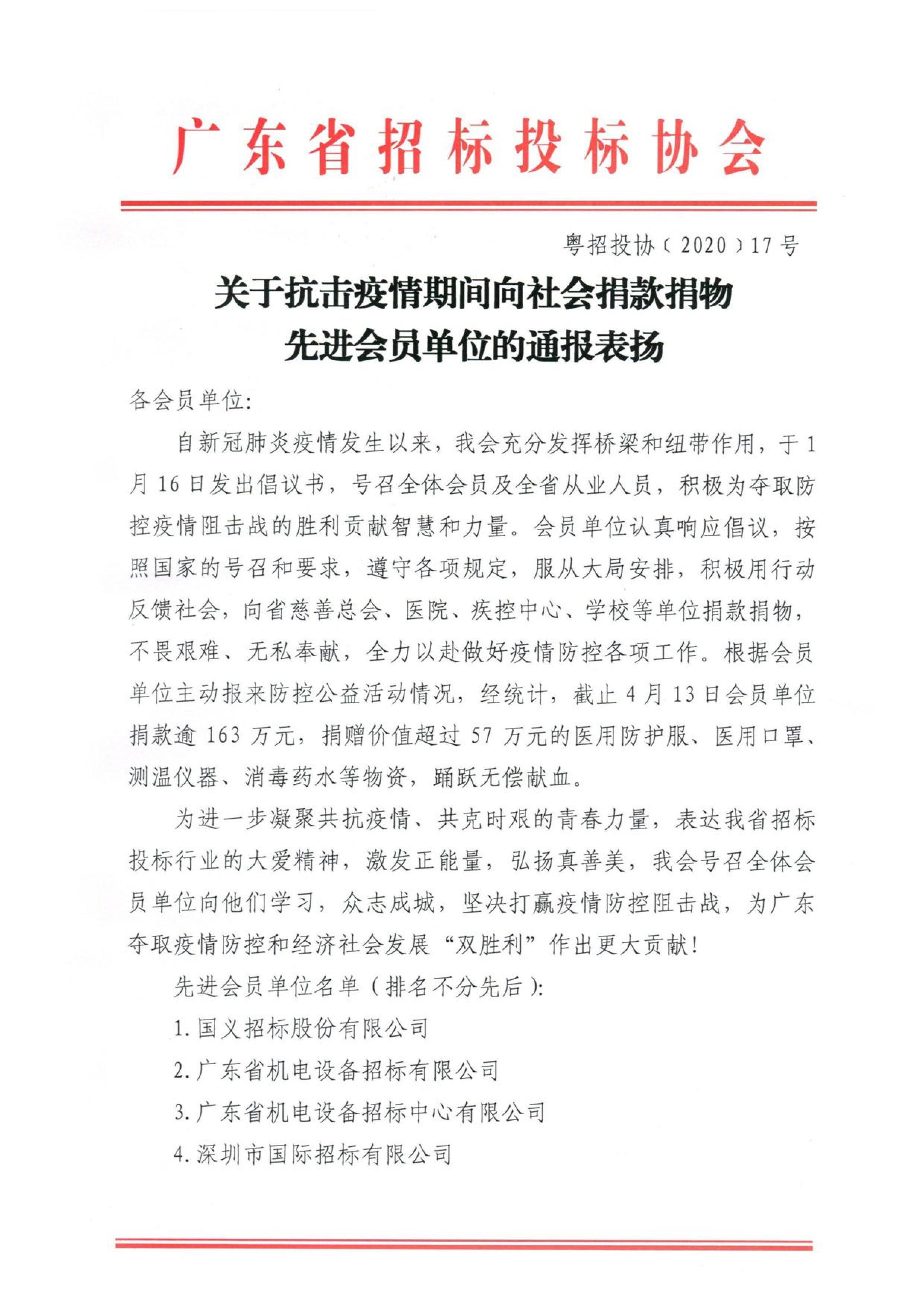 近日,我公司及員工在抗擊疫情期間踴躍捐款、獻血奉獻愛心,積極用行動為抗疫貢獻力量,公司獲得了廣東省招標投標協(xié)會的通報表揚。