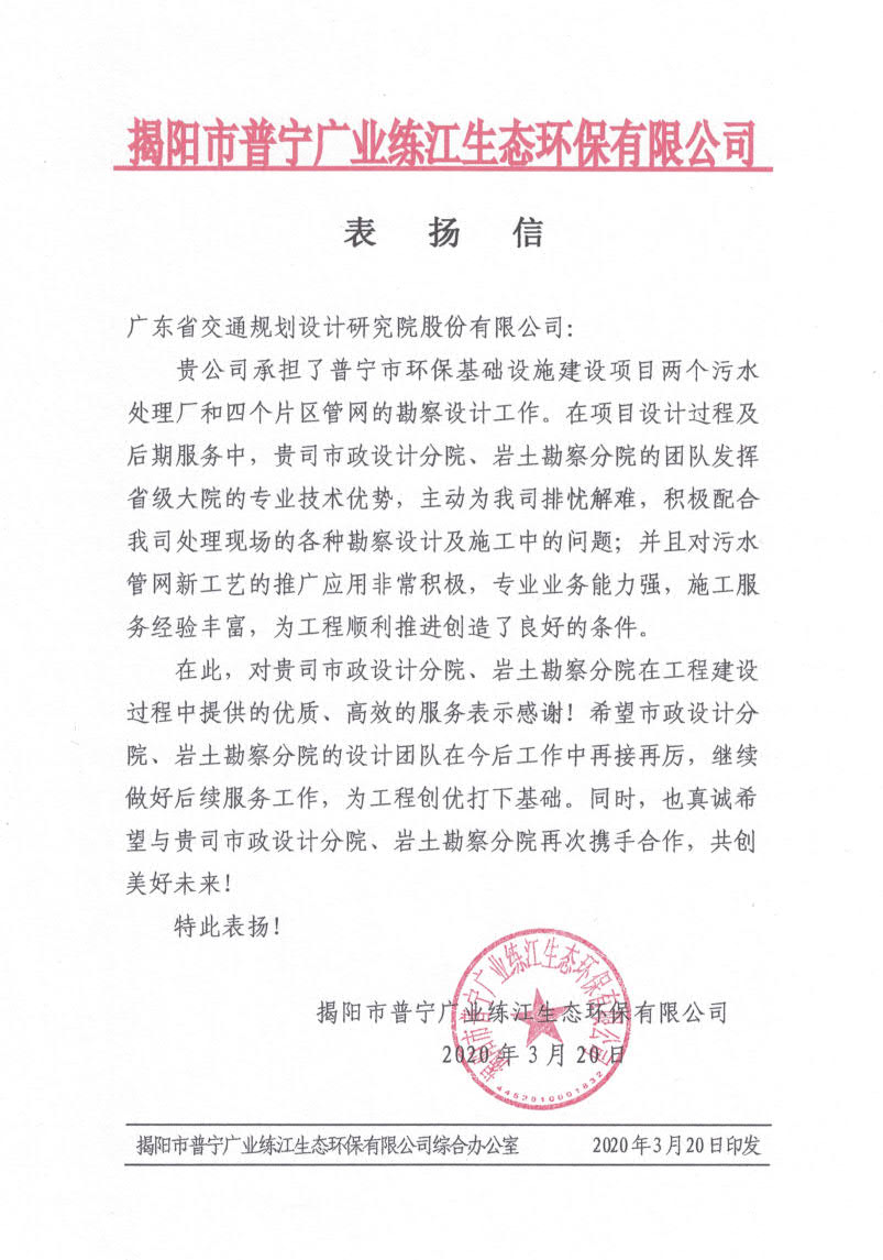 近日,揭陽市普寧廣業(yè)練江生態(tài)環(huán)保有限公司發(fā)來表揚信,對我公司在普寧市練江環(huán)保基礎(chǔ)設(shè)施建設(shè)項目勘察設(shè)計和施工后服務(wù)工作中,體現(xiàn)的專業(yè)技術(shù)優(yōu)勢、專業(yè)服務(wù)能力、豐富的施工服務(wù)經(jīng)驗以及積極推廣應(yīng)用新工藝的實際行動表示充分肯定,并對我公司具體負責(zé)該項目的市政設(shè)計分院和巖土勘察分院團隊給予了通報表揚。