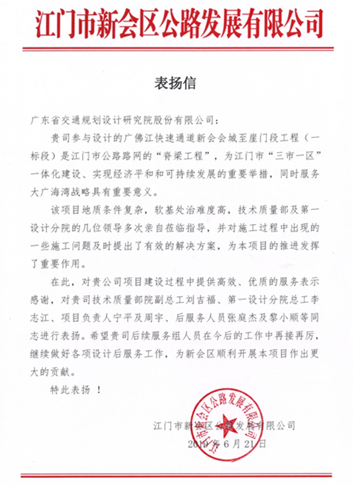 江門市新會區(qū)公路發(fā)展有限公司對我司在廣佛江快速通道新會會城至崖門段工程(一標(biāo)段)項目建設(shè)過程中提供的高效、優(yōu)質(zhì)服務(wù)表示了感謝,對參與該項目的技術(shù)質(zhì)量部院副總工劉吉福、第一設(shè)計分院總工李志江、項目負責(zé)人寧平及周宇、設(shè)計后服務(wù)人員張庭杰及黎小順等同志給予了通報表揚。