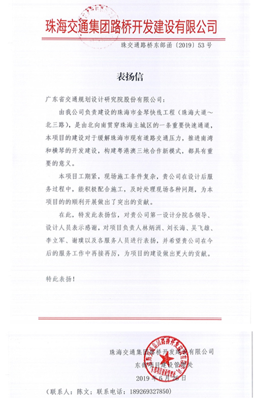 珠海交通集團路橋開發(fā)建設(shè)有限公司對我司在珠海市金琴快線工程(珠海大道~北三路)項目設(shè)計后服務(wù)過程中做出的突出貢獻表示了肯定,肯定我司員工良好的職業(yè)素養(yǎng)與優(yōu)秀的技術(shù)服務(wù)水平,對該項目的負責(zé)人林炳洲、劉長海、吳飛雄、李立軍、謝璞以及各服務(wù)人員進行了表揚。