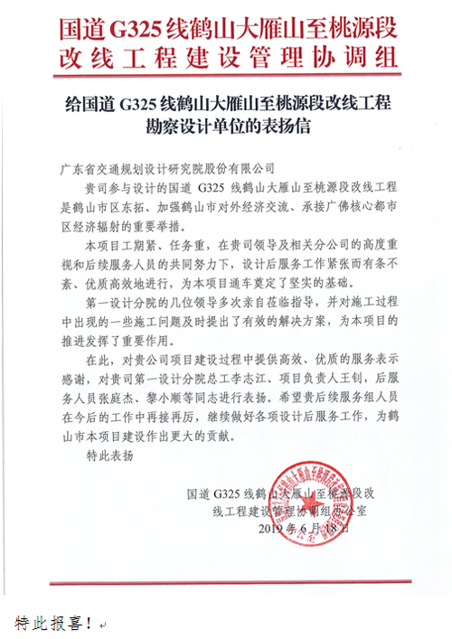 國道G325線鶴山大雁山至桃源段改線工程建設(shè)管理協(xié)調(diào)組對我司在國道G325線鶴山大雁山至桃源段改線工程項目建設(shè)過程中提供的高效優(yōu)質(zhì)的設(shè)計后服務(wù)表示了感謝,對我司第一設(shè)計分院總工李志江、項目負責(zé)人王釗、設(shè)計后服務(wù)人員張庭杰與黎小順等同志給予了通報表揚。