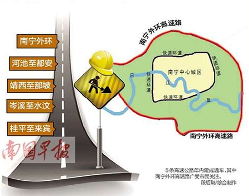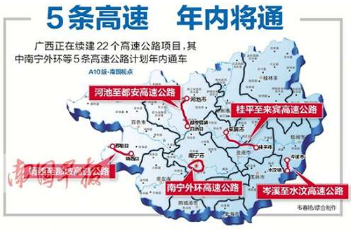 今年自治區(qū)續(xù)建的高速公路項目共有22個,建設(shè)高速公路里程2270公里。計劃年內(nèi)建成通車的南寧外環(huán)、河池至都安、靖西至那坡、岑溪至水汶、桂平至來賓5條高速公路,目前正緊張有序地開展路面基層、面層、交安、房建、綠化等各項施工,進(jìn)展順利,計劃新增高速公路里程約389公里。其他17個續(xù)建項目中,完成計劃總投資在70%以上的項目有6個,其中百色至靖西、陽朔至鹿寨、灌陽至鳳凰完成計劃總投資超過80%。此外,計劃年內(nèi)開工吳圩機場至大塘、河池至百色、沿海高速公路改建工程南間至欽州段、柳州至南寧高速公路改擴建工程4個項目,開工里程超過600公里;力爭開工荔浦至玉林、樂業(yè)至百色、松旺至鐵山港等高速公路項目。